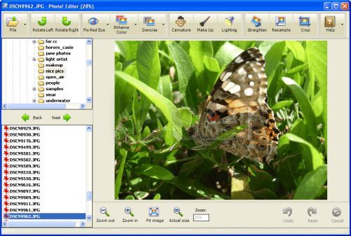 With Photo! Editor, you can remove red eye instantly, enhance the color of the image, make funny caricatures, add astonishing lighting effects, straighten, resample and crop images. The Denoise tool is one of the world's best to effectively remove luminance and color noise from digital images made under poor lighting conditions. You will also appreciate the Make Up tool that offers a complete set of retouching filters to make the best of your portrait photos.