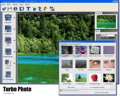 Stepok Turbo Photo is a very easy to use yet powerful image editing/processing software that is designed for digital camera owners. It offers professional image enhancement options without requiring you to have any technical knowledge of digital imaging. The program starts out with a wizard dialog that ask you "what is wrong with your picture?" and offers you to choose the option from an example dialog. From then on, it takes you step by step through correcting or enhancing your image while constantly offering you previews of possible options as well as the original to compare to. You simple select which suggested version of the image looks best or adjust the settings to further improve it. In many cases, you will be able to turn an average photo into a great one within a matter of minutes while others may need some fine tuning, which can be easily done, regardless of your experience. Exposure, color, composition, sharpness, and the contrast can be easily mastered and controlled by you. If you are a more advanced user, you can use the manual adjustments and bypass the wizards to totally control the photo quality. Turbo Photo offers many types of enhancements, including color balance and HSB mode adjustment, noise reduction, skin beautification, rotate, crop and much more. The skin beautification mode allow you to instantly remove blemishes by simply clicking on them, soften the skin tone and more. In addition, you can add frames, insert text, batch edit and print, view slideshows and more. Turbo Photo can automatically select the best format for the file when you re done. The program supports JPG, TIFF and other formats as well as EXIF. It allows even complete newbies to create perfect pictures and provides plenty of features to satisfy even advanced users.